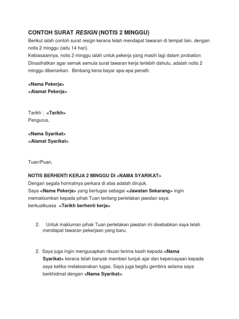 Contoh surat berhenti kerja yang mudah dan ringkas. Sekiranya perjanjian sewaktu anda masuk bekerja menetapkan syarat bahawa notis satu bulan untuk berhenti kerja, anda perlu mengikut syarat tersebut. Saya berbuat demikian adalah kerana ingin menyambung pelajaran. Namun jika anda ingin mengajukan berhenti kerja sementara selama beberapa bulan, hal tersebut kini bisa anda lakukan dengan mengajukan surat berhenti kerja sementara. Surat berhenti kerja notis 2 minggu.