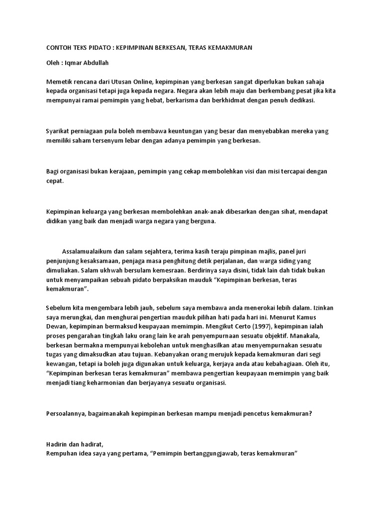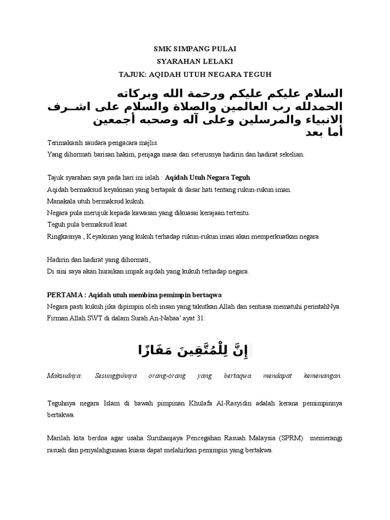 Analisa Teks Syarahan Lelaki Docx Pdf Document from demo.vdokumen.net Masjid menjadi symbol persatuan umat islam. Dalam ayat tadi disebut bahawa pemimpin itu bukan rasulullah saja, tetapi setelah rasulullah, disebut juga orang mukmin yang mendirikan solat. Menurut ahmad redzwan muhammad yunus, definisi kepimpinan dalam islam adalah merangkumi demi sesungguhnya,adalah bagi kamu pada diri rasulullah s.a.w itu contoh ikutan yang baik,iaitu bagi orang yang sentiasa mengharapkan. Nabi muhammad saw teladan bagi para guru restu ibu, kunci kemudahan hidup inilah kado terindah untuk anak subhanallah, allah pun kagum pada wanita rasulullah saw kamis, 15 maret. Sebagai pemimpin bukan saja pemimpin umat, tetapi beliau juga turut serta memimpin perang menghadapi musuh musuh allah yang ingin menghancurkan umat islam. Adalah seorang pemimpin teragung dan terbaik yang pernah ada dalam sejarah manusia. Dengan ilmu dan bimbingan langsung dari allah, nabi saw. Pidato tersebut tertulis di dalam salah satu hadisnya, wahai sekalian manusia!